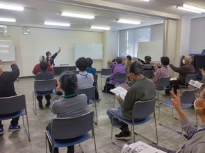 「100歳まで動ける体を目指して~腰痛予防と体の使い方のコツについて~」と題し、船橋市立リハビリテーション病院の遠藤稜先生(理学療法士)をお招きし、講義と体の動かし方などを学びました。まずは講師との「後出じゃんけん」や、隣の席の方との「共通点探し」をしながら、体と心をリラックスさせていきました。